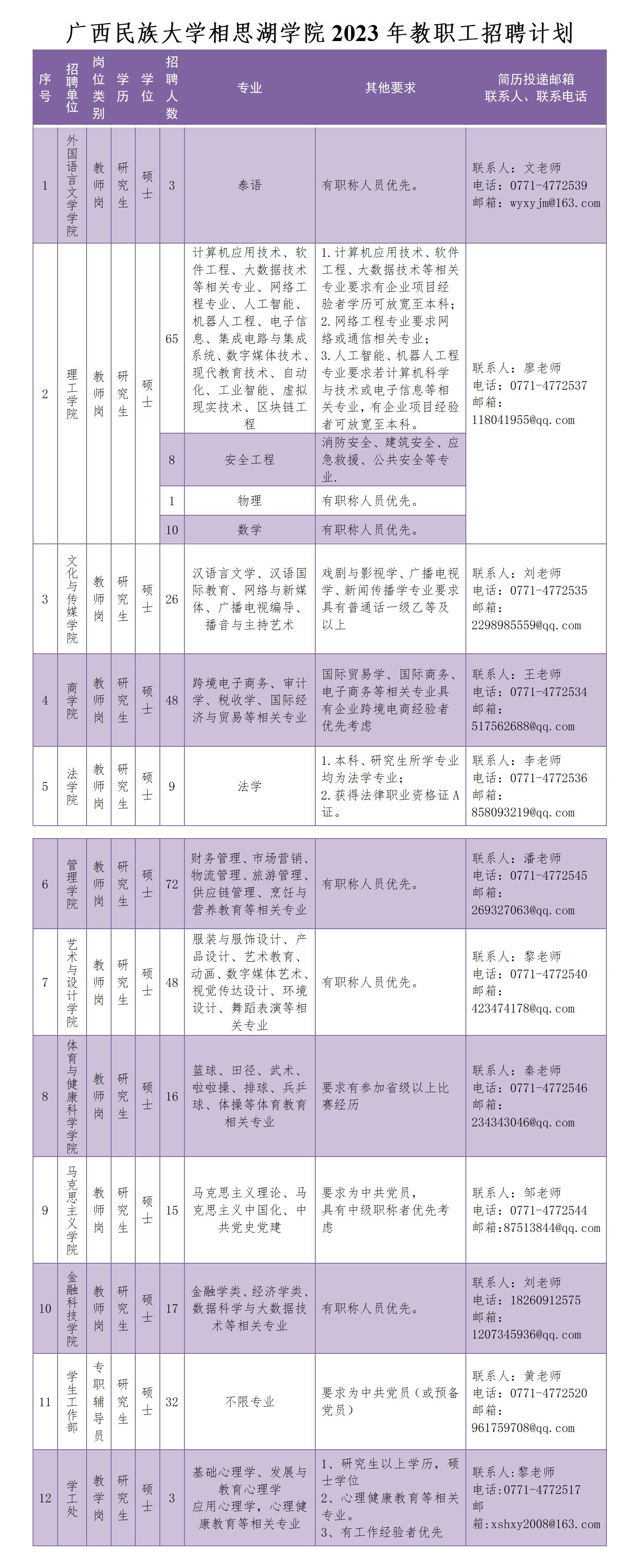 广西民族大学相思湖学院2023年教职工招聘计划